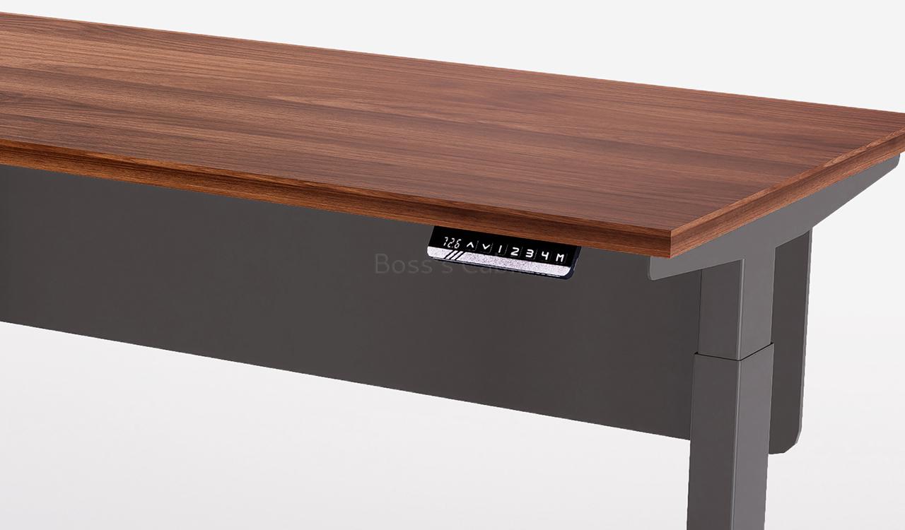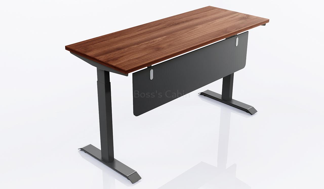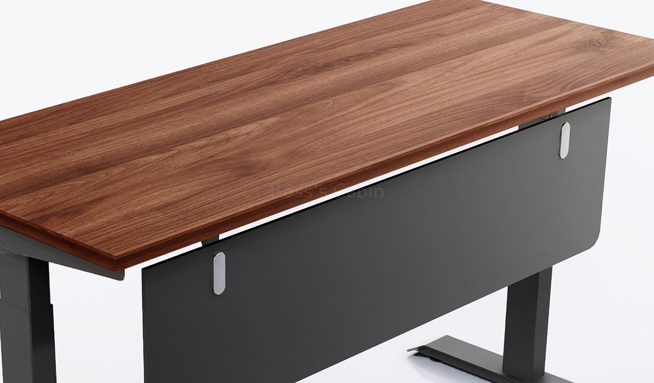 Walnut finish laminate tabletop with two tier height adjustable base having electrostatic powder coating. Also included is a modesty panel and a touch sensitive control panel.