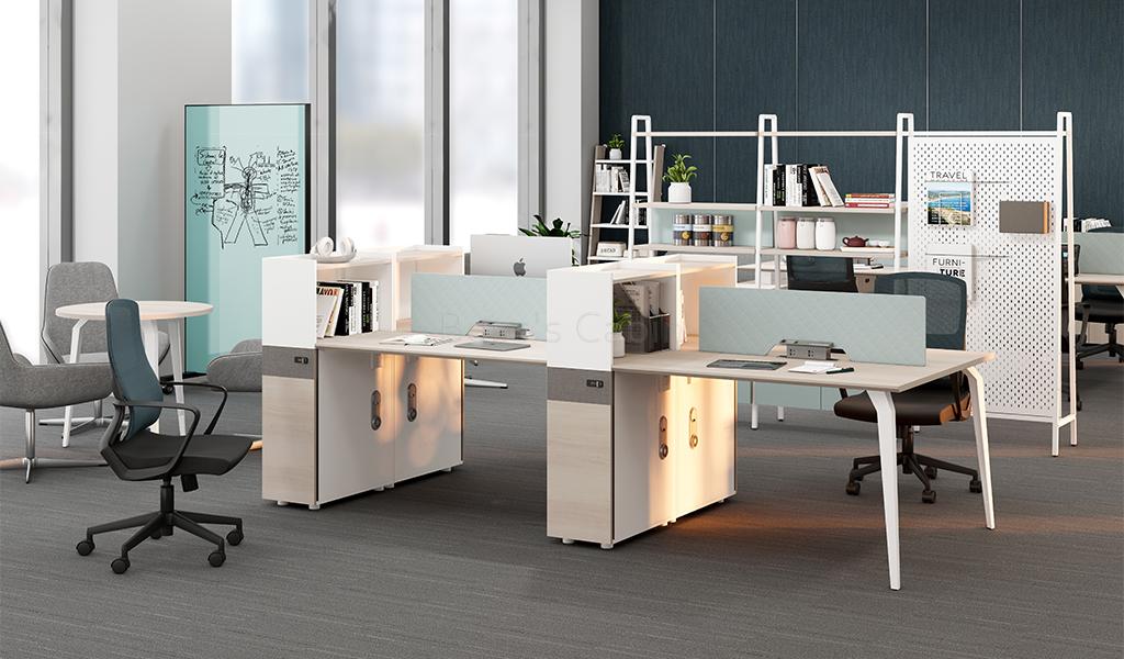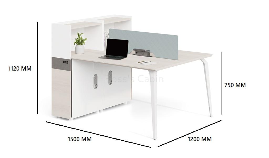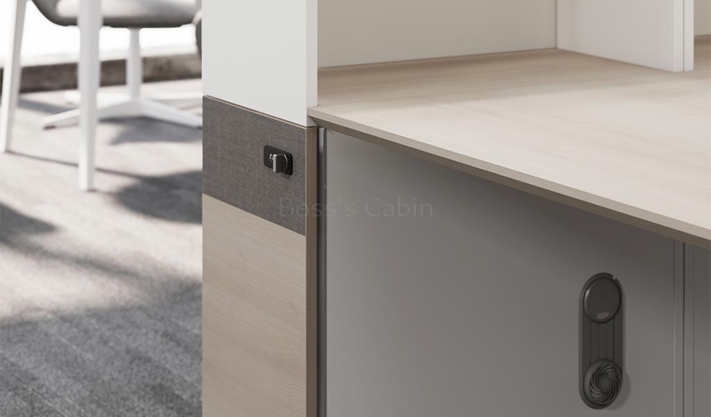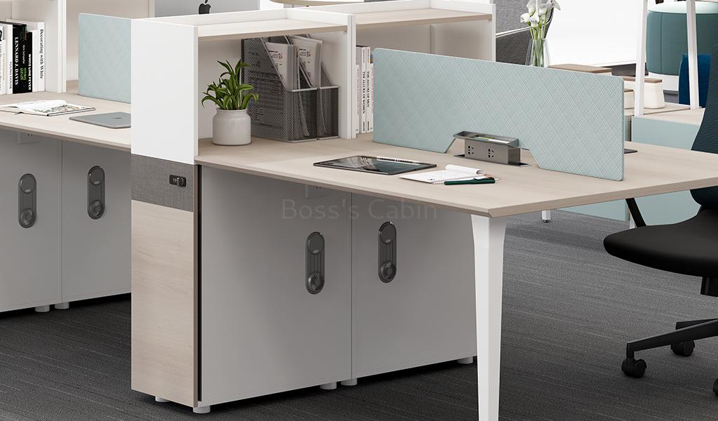 A smart and functional linear workstation system that is easy to install. Put together multiple units and create various combinations to fit your workspace. A two seater unit includes natural wood finish desktop, fabric screen, fixed storage pedestal with number lock, desktop storage cum partition, inbuilt power sockets and wire management provision. A perfect modular solution for a modern office.