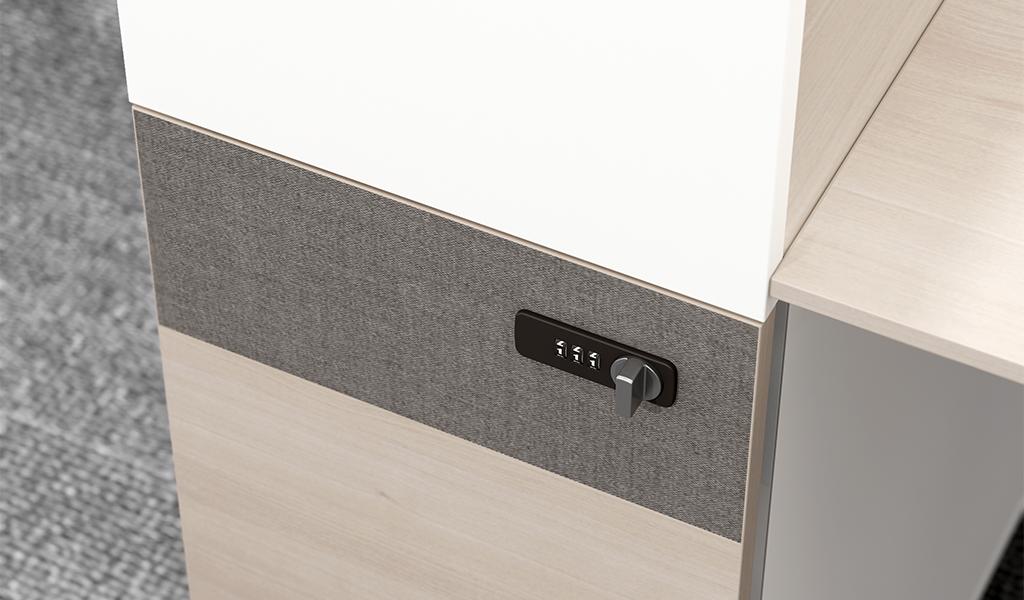Pearwood laminate tabletop, powder coated white metal legs, acqua green fabric screen, fixed pedestal with number lock, universal power sockets and table top storage cum partition.
