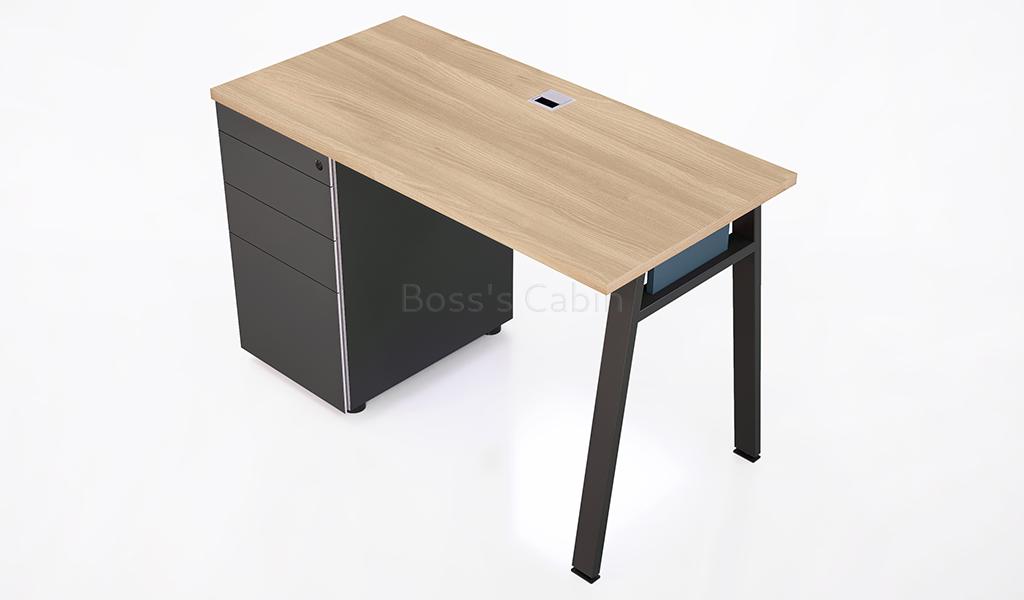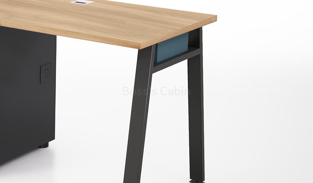 This one seater office workstation looks best in oakwood, meteor gray and dark cyan combination  as seen in the image.