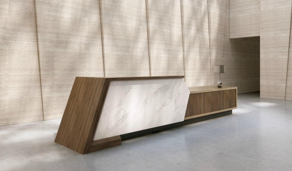 This large and contemporary reception desk comes in its original glossy white Corian stone with oak and walnut veneer combination as seen in the picture.