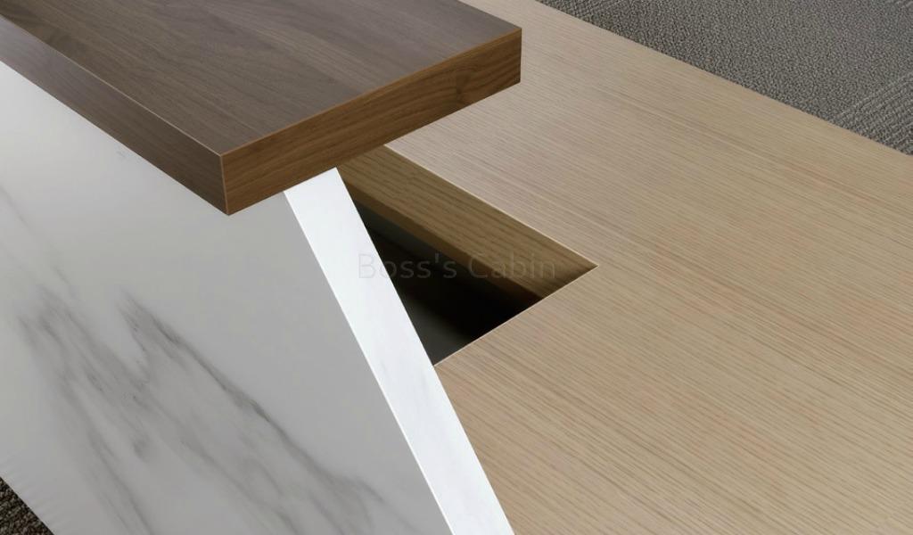 Corian stone & veneer front panel, reception counter and worktop with inbuilt storage and wire management provision. In addition there are also two USB ports fitted on the desktop.