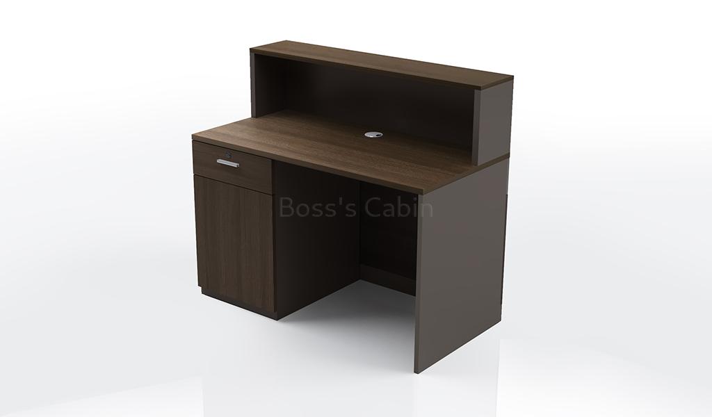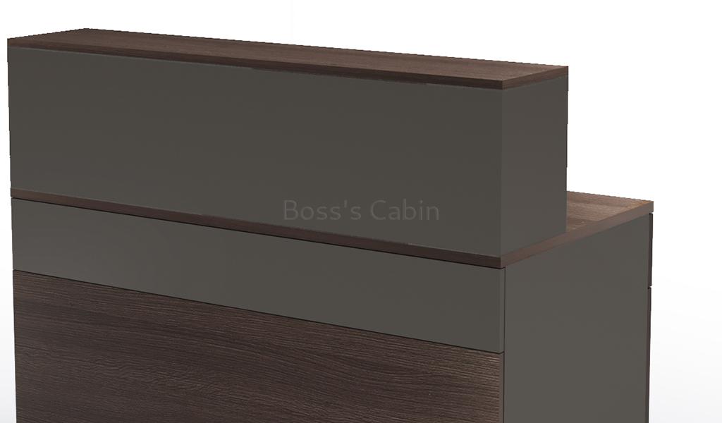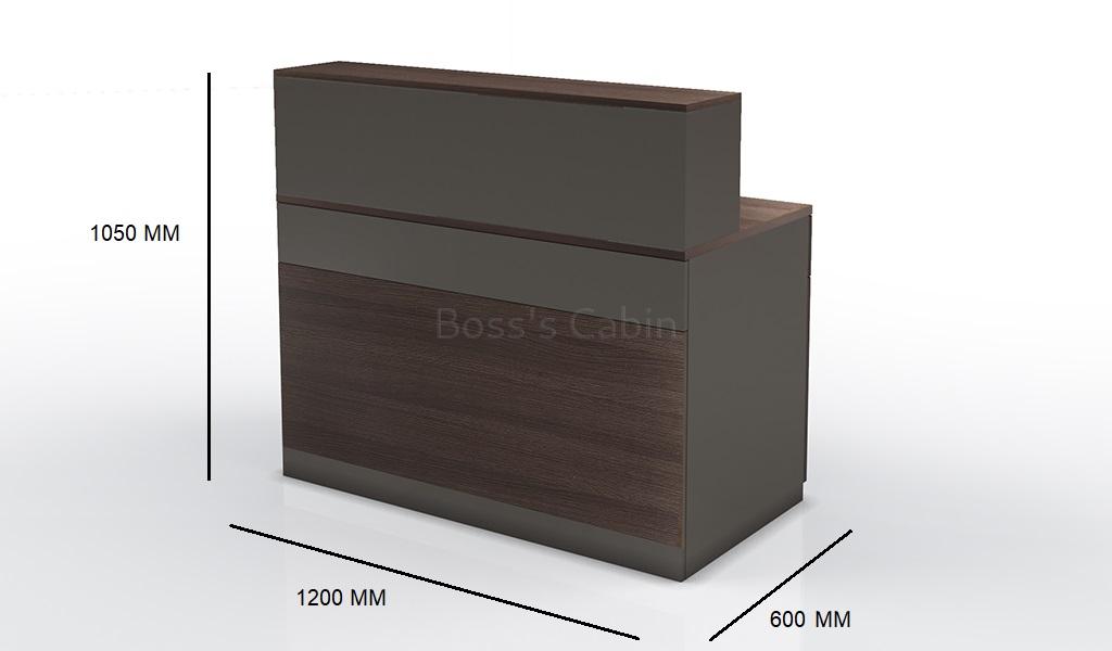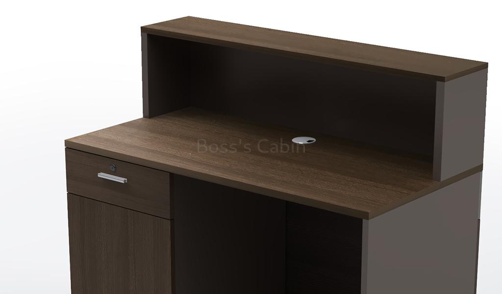 A small 4 feet reception table with a coffee oak and dark gray finish front panel. Designed to seat one person the compact reception desk includes one fixed storage pedestal and inbuilt wire management grommet. Suitable for small reception areas and entrance lobbies. It can also be used in retail stores as a billing counter.