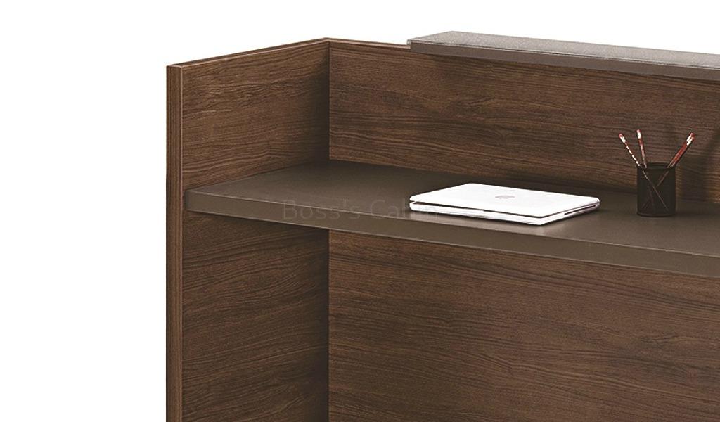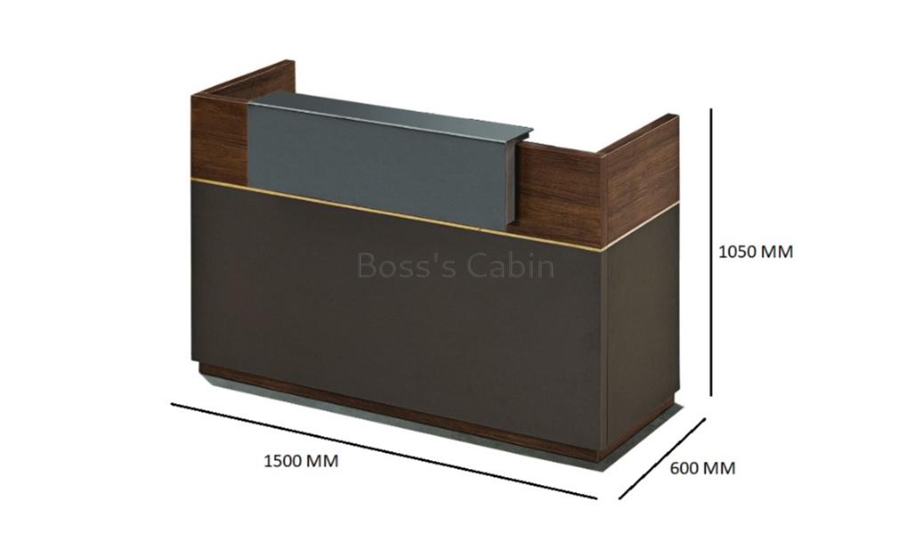 An elegant and space saving 5 feet width reception table ideal for a single user. Designed in a combination of King walnut and Kano gray laminate it features an inlaid brass strip detailing that adds to its premium looks. In addition the counter top is further complemented with a matt gray acrylic layer that wraps over the edge of the front panel. Pairs seamlessly with all Miro series products.