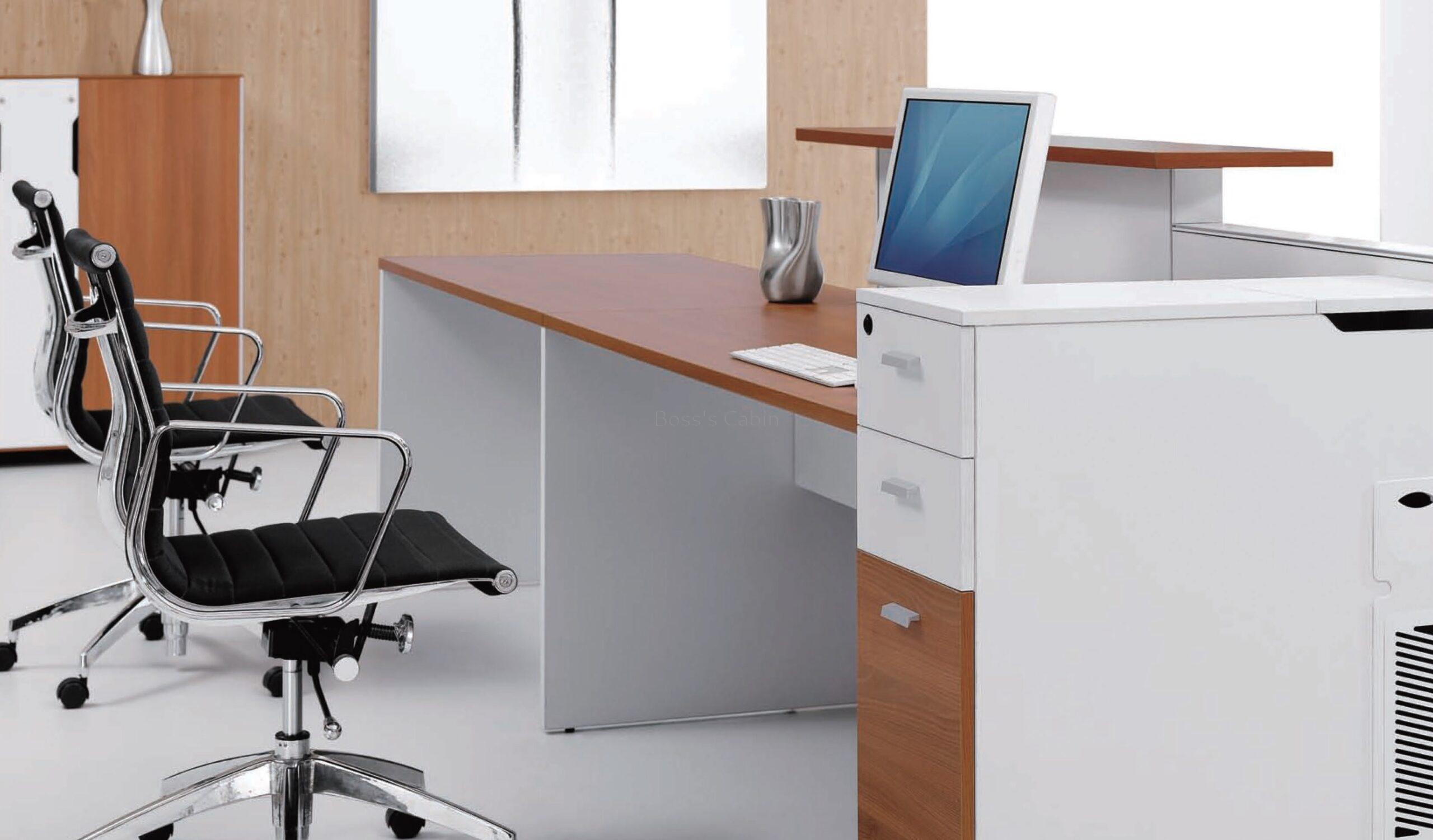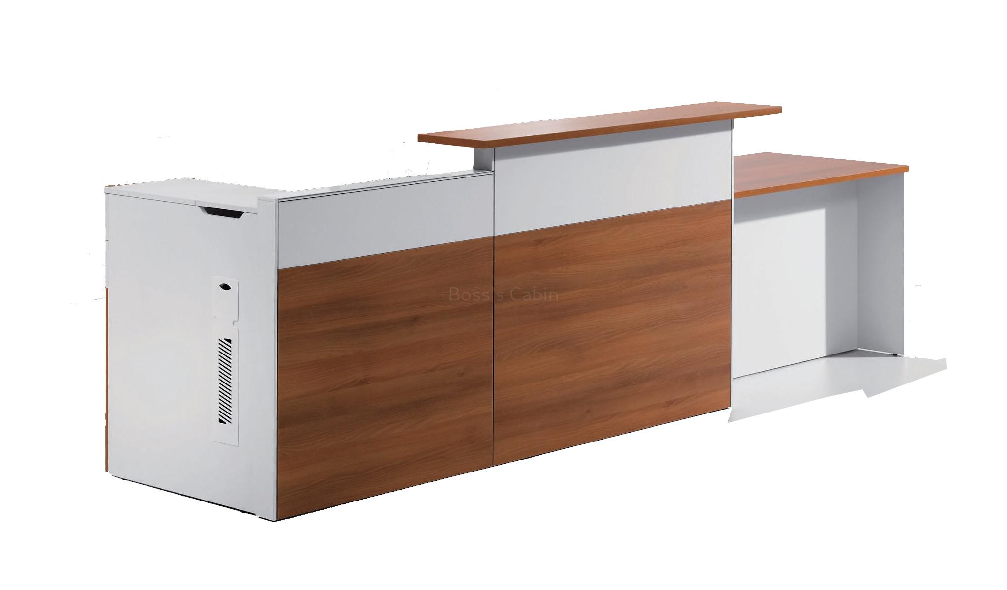 An eleven feet width large two seater reception table suitable for seating two front desk managers. Finished in a combination of natural wood finish laminate and white. Includes ample storage space with multiple storage provisions.