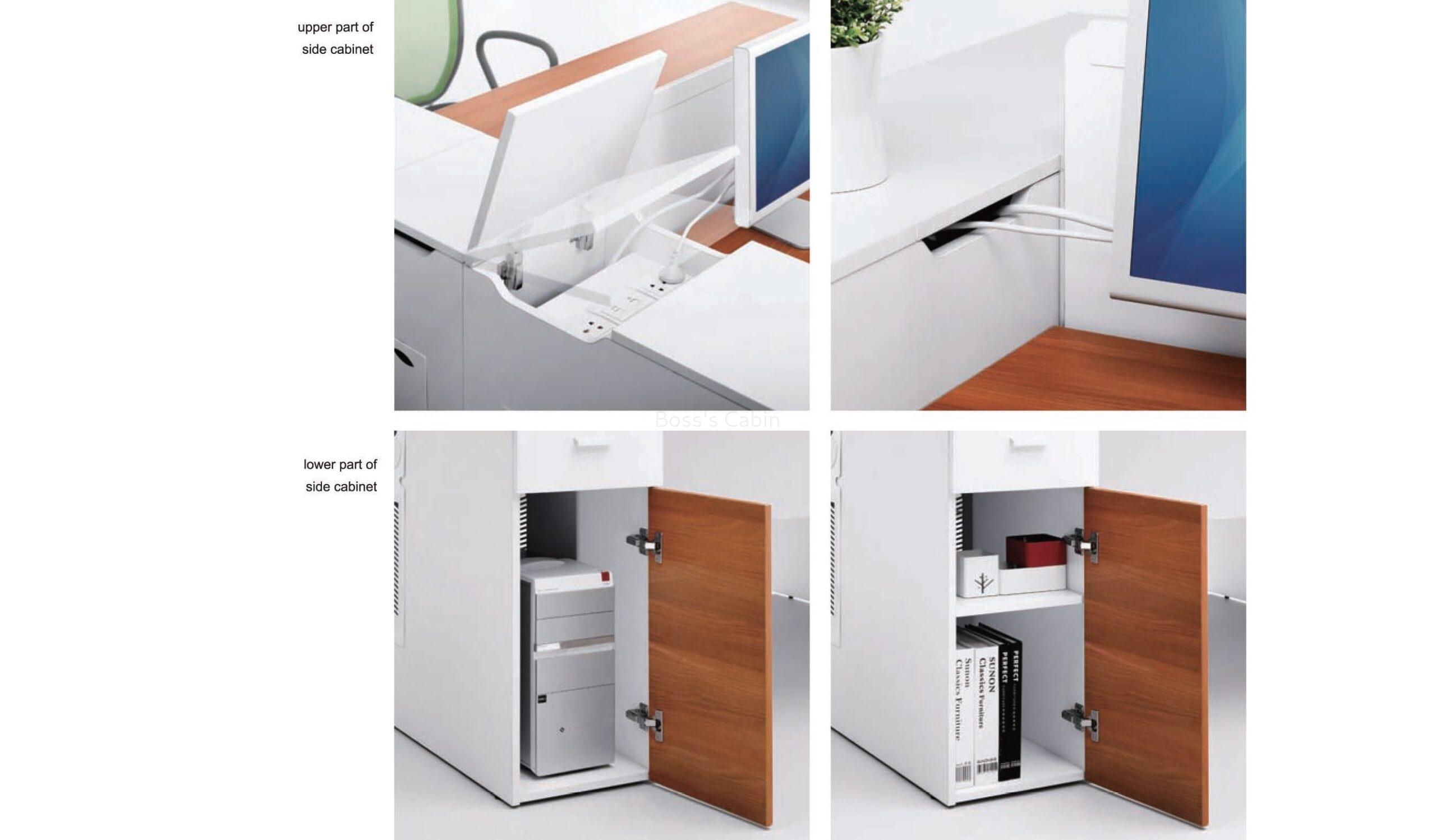 MDF and laminate top and base with storage and built in wire management provision for power and other connectivity.