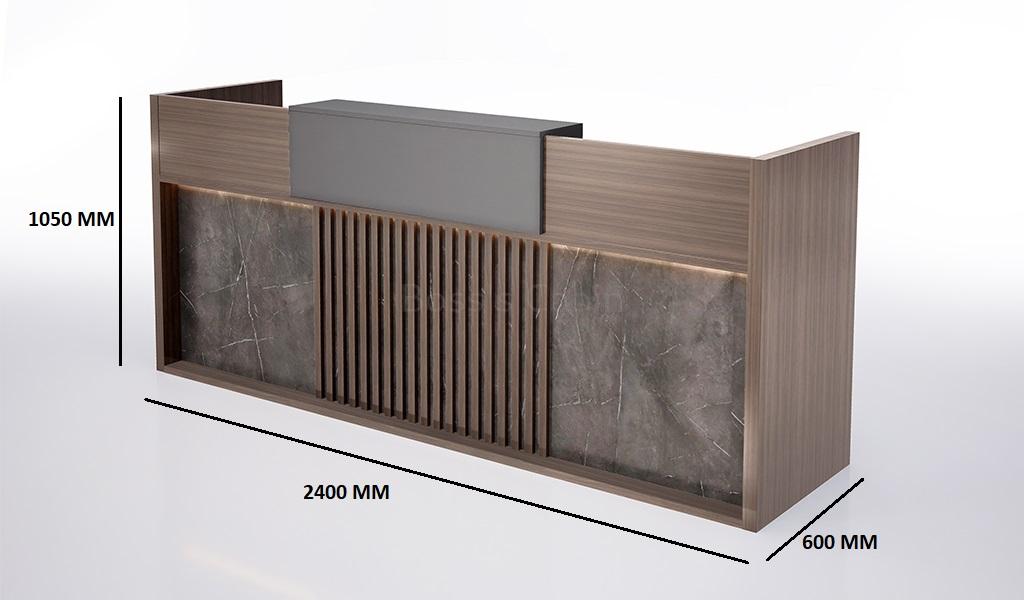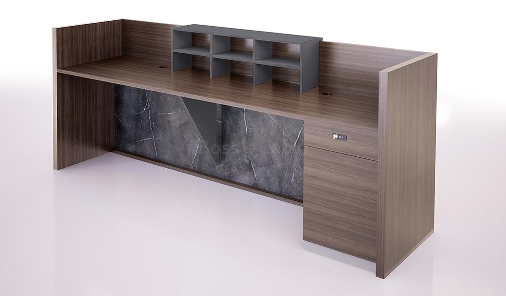 An elegant 8-foot reception table in a Pari walnut and Advanced grey finish, featuring a slate stone laminate façade with walnut finish fluting and concealed front LED lighting. Seats up to two people and includes a fixed pedestal with number lock, utility shelves, and wire management. Part of the Nexa Series, it's ideal for reception areas, lobbies, or as a billing counter in retail spaces.