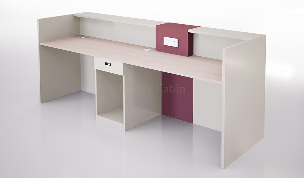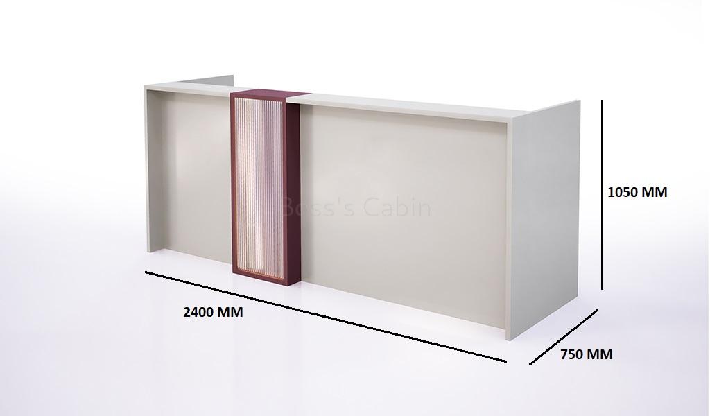 A stylish 8 feet reception table in Seagull gray and Canyon red having a fluted acrylic back-lit front panel. Designed for a seating capacity of two persons the worktop is finished in pearwood laminate. Includes a storage drawer with lock and integrated power sockets for enhanced utility. Suitable for medium to large size reception areas and entrance lobbies it can also be used in retail stores as a billing counter.