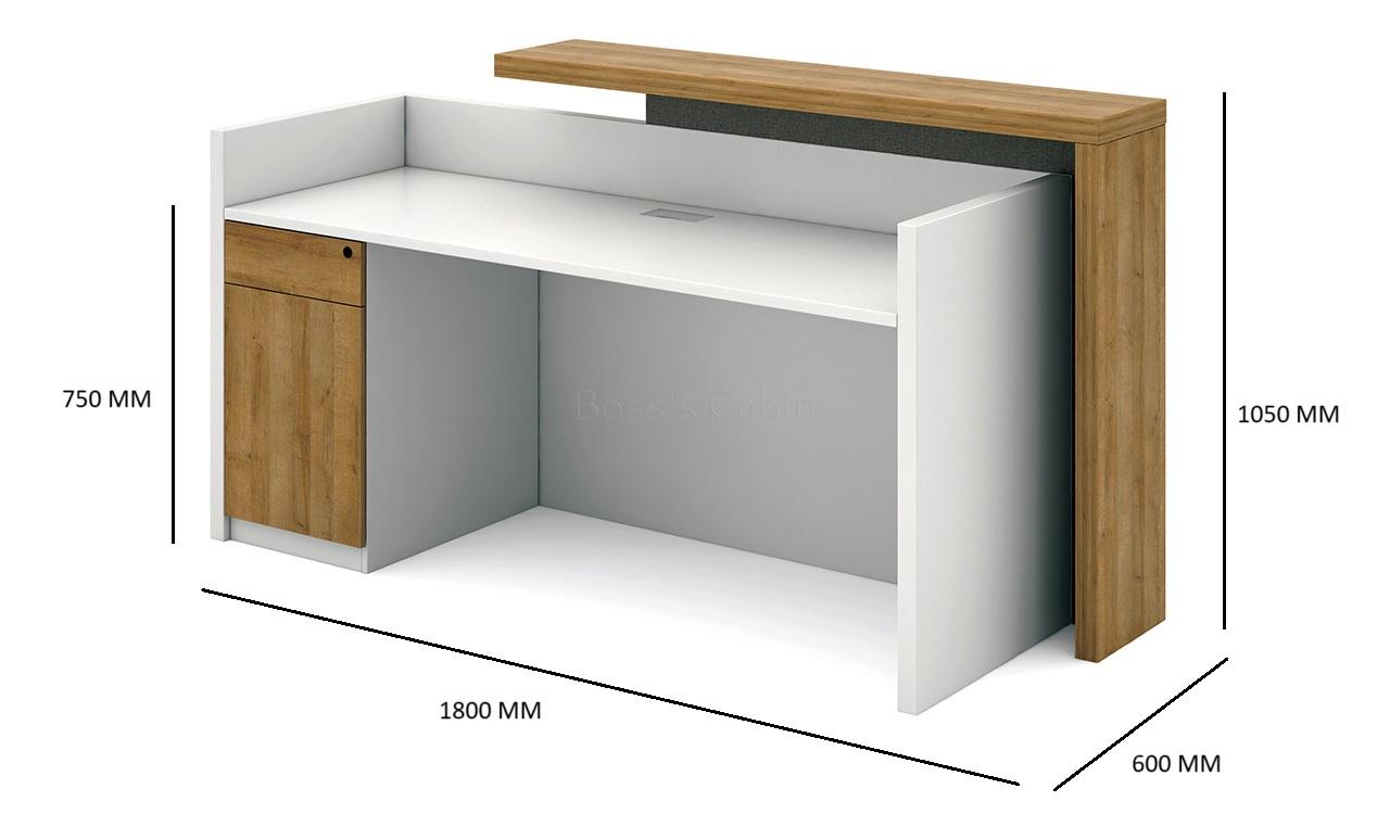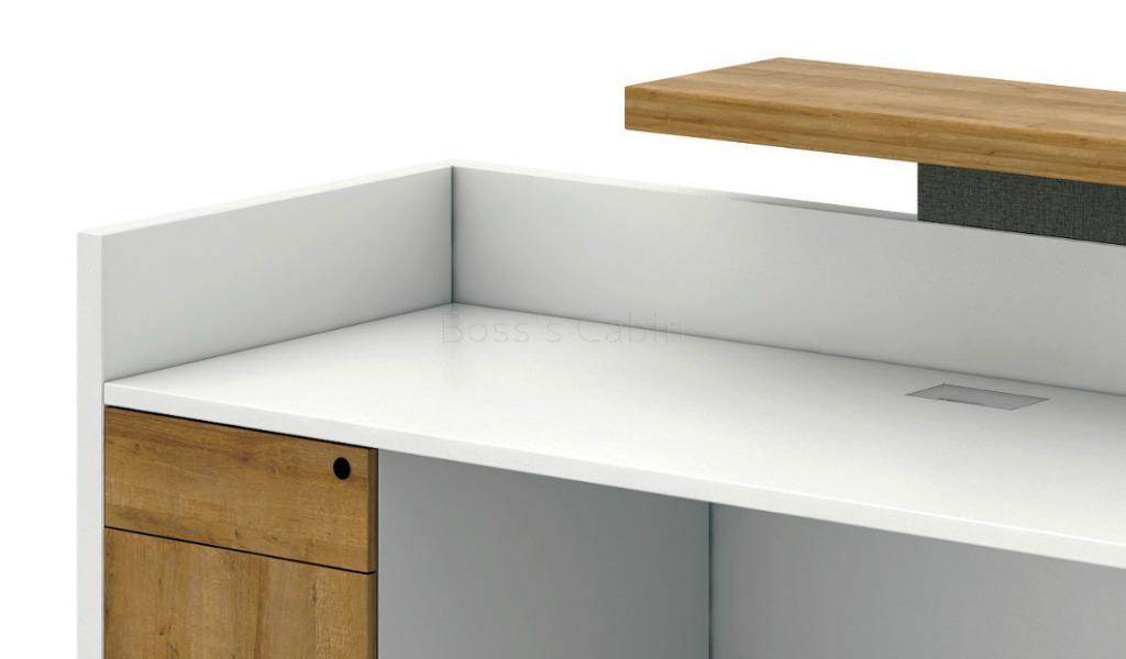 A contemporary 6Â feet width reception desk finished in a combination of solid white and light oak laminate. Designed with elements of solid wood, its sleek and trendy looks make it a perfect choice for modern offices. This space saving front desk also includes a storage pedestal with lock for added convenience and functionality. Suitable for seating one person it is built with top grade raw materials for lasting durability, natural feel and luxurious looks. It is part of the Mobilis series which offers many more options for reception tables.