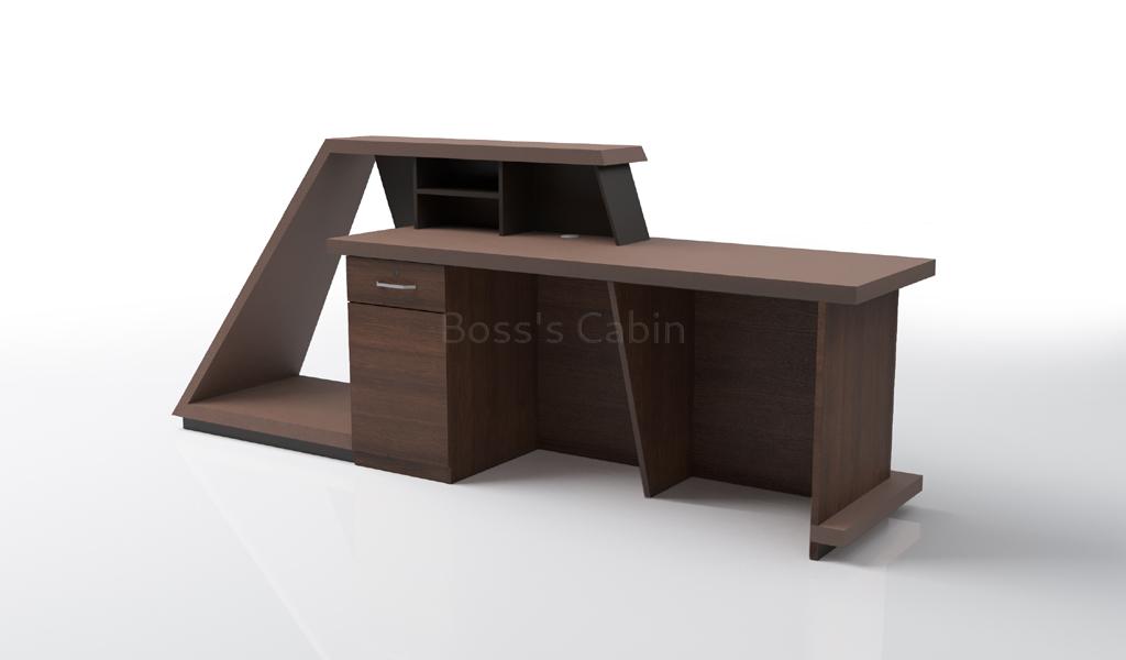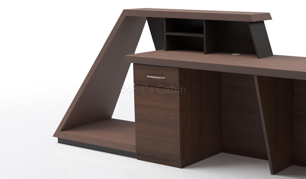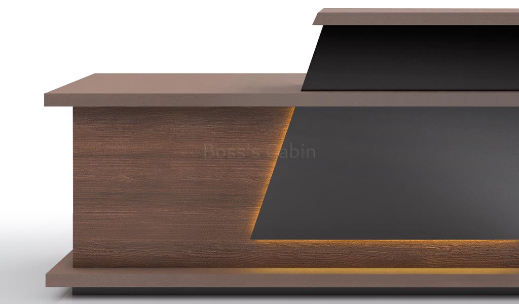 The front panel in a combination of different finishes like lacquer, natural wood and laminate while the inside is in walnut finish. The reception table also includes one inbuilt storage pedestal.