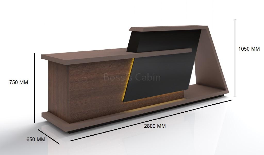 A large & stylish, 9 feet width reception table finished in a combination of black, gray and walnut finish. Designed with elements of solid wood and lacquer, it has a contemporary and trendy look which is perfect for modern lobbies and receptions. This spacious front desk also includes a storage pedestal with lock for added convenience and ease. Suitable for seating up to two persons, it is impeccably built and finished with top grade raw materials and concealed cove lighting for lasting durability, natural feel and luxurious looks. It is part of the Mobilis series which offers many more options for reception tables.